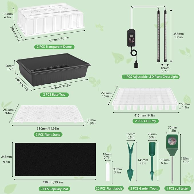 - COMPLETE KIT: Includes 60-cell self-watering tray, LED grow light, adjustable timer, humidity dome, soil pH meter, gardening gloves, and seedling tools